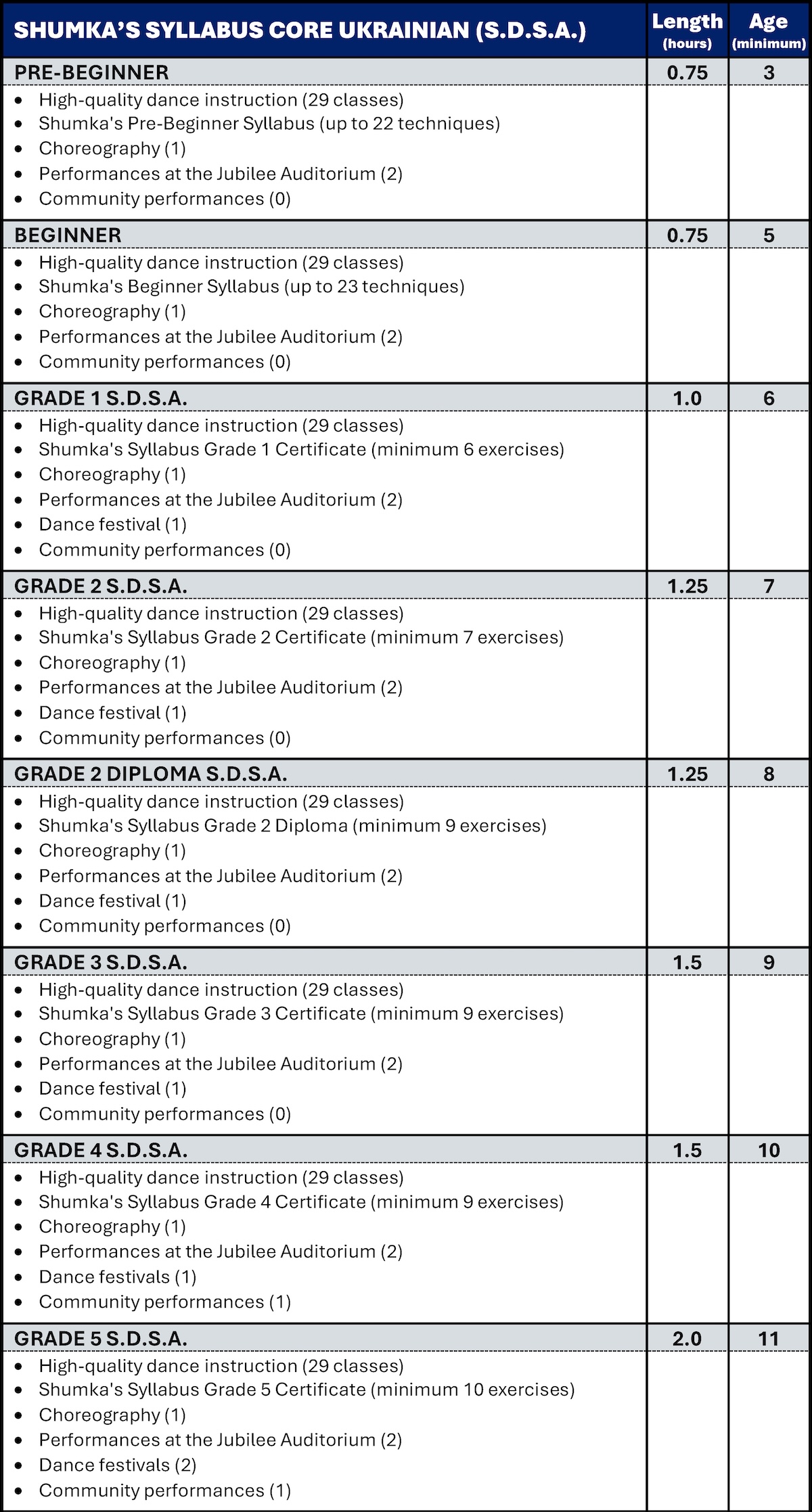 It is important to note that each grade in the Shumka Syllabus is designed to align with a specific age and corresponding physical growth level. For instance, if a dancer starts Grade 1 at age five, they will be one year younger than the expected physical level for Grade 4 by the time they reach that stage.