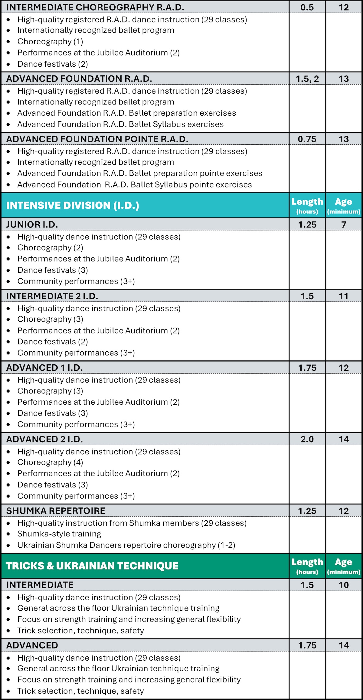 Students within the Intensive Division are required to enroll in specific classes, which typically include the main choreography class, one or two classes in R.A.D. Ballet, and an additional class of the dancer’s choosing. The third-class option offers flexibility and can be another R.A.D. Ballet class or a Tricks class, catering to the dancer’s interests and growth. Furthermore, students in the highest-level of the Intensive Division are enrolled in the Shumka Repertoire class, further enhancing their skills, repertoire, and style.